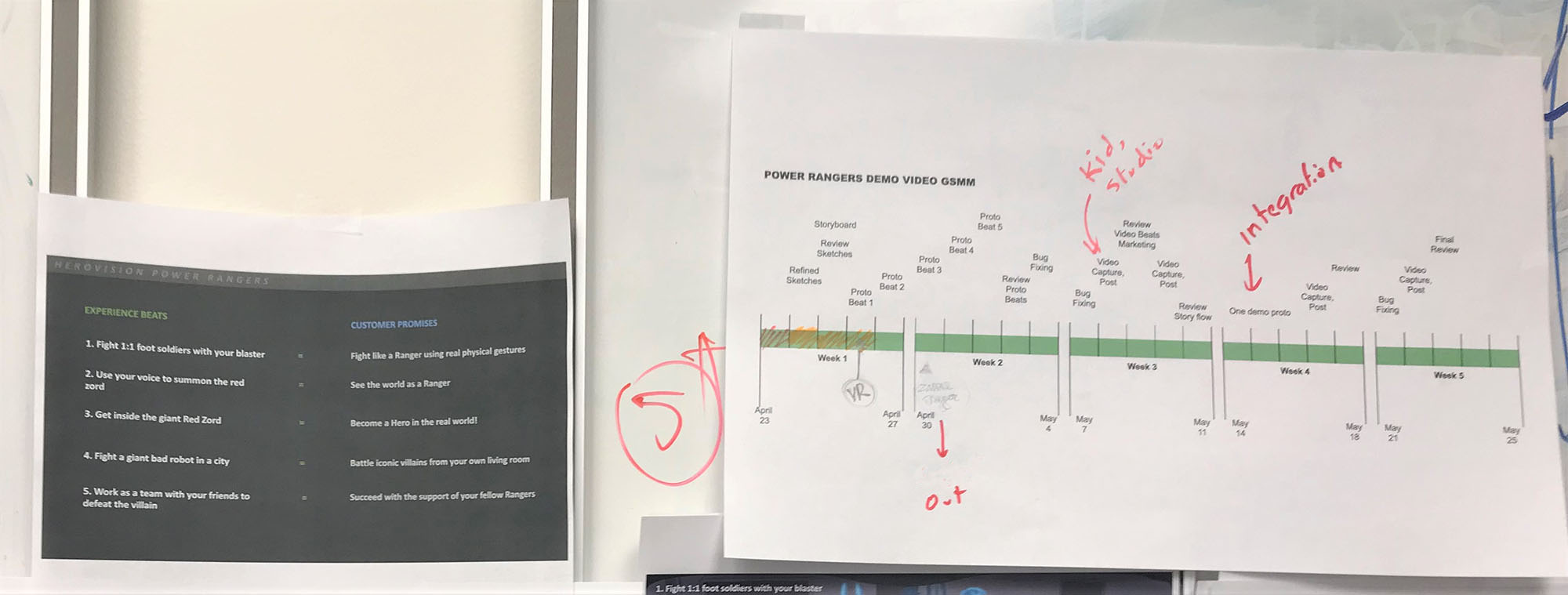 We worked with the group making some quick sketching; we talked about what is the "Power Rangers" IP and what it represents; we picked 4 or 5 ideas we thought fit with the Power Ranger storyline and lore, focusing on the actions and hand gestures of the hero character. Since the technology allows for 6 DOF (degrees of freedom) on the hand markers recognition. We debated about the feasibility of some of the ideas, but I also wanted to push the envelope with some of the interactions since we knew we could do quick prototypes in Unity to proof the tech possibilities.